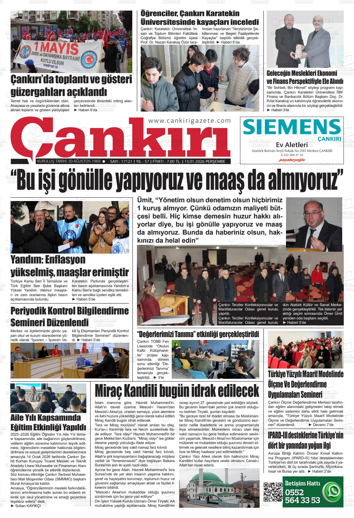 Çankırı Yerel Gazeteleri 15 Ocak 2026, Perşembe Günü Manşeti